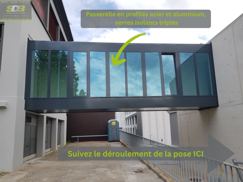 Rue Volta à La Chaux-de-Fonds, SDB Constructions Métalliques a installé une élégante passerelle en acier, accompagnée de vitrages aluminium avec impostes en façade Ouest.
